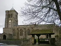 In the churchyard are a number of structures that have been designated as Grade II listed buildings. To the south of the church is a cross erected in 1920 as a memorial to those who died in the First World War. It is in the form of a Celtic cross, and was designed by J. F. Curwen.[7] The lych gate is dated 1894 and has sandstone piers with timber above, and a slate roof with a stone ridge.[8] Immediately to the south of the church is a table tomb to the Docker family, the earliest inscribed date being 1766.[9] To the south of this is another table tomb, this one being to the Crampton family, with an earliest date of 1760.[10] To the southeast of the church is a table tomb to the Dickinson family with an earliest date of 1763, although it was probably not erected until 1770.[11] To the south of the Dickinson tomb is a sandstone sundial dated 1690.[12]