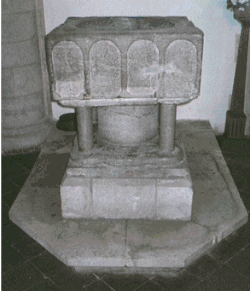 The church has a chalice dating from Elizabethan times and also an ancient font. The architect Ian Nairn, dated the font as being constructed at around 1100.[16] However, this was seen as a little early by other historians. The font, which is made of Purbeck marble, Heron-Allen suggests was of a type that was very common in the south east counties in the 12th century, having shallow bodies with circular basins standing upon a square base and supported by a large central and small angle shafts.[17] The architect Philip Mainwaring Johnston was responsible for the reredos.[18] The church is a Grade II listed building.[19]