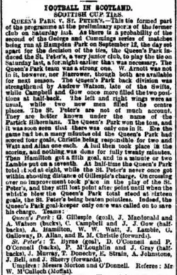 In August 1885, the club changed its name to St Peter's (possibly named after St Peter's church in Partick), joined the Scottish Football Association, and entered the 1885–86 Scottish Cup. The club had the misfortune to be drawn at Queen's Park in the first round, and the tie was moved up a week so that it could be one of the entertainments at the Queen's Park athletic sports.[4] Within ten minutes, Queen's Park was four goals to the good, by half-time the score was 8, and by the end 16, St Peter's only making Gillespie in the Queen's Park goal work once.[5] The score remains the Spiders' record victory[6] and, at the time, was the second-highest win in the Scottish Cup.