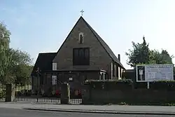 About 3 miles (4.8 km) from Hailsham was the village of Upper Dicker, a stronghold of Protestant Nonconformism (the 400-capacity Zoar Strict Baptist Chapel had opened in 1838).[5] One resident was a Catholic convert, though, and she wrote to Bishop of Southwark Peter Amigo in 1915 asking for part of her house (Elm Cottage)[6] to be used as a public oratory for herself and local Catholics.[7] Permission was granted, and Fr Paul Lynch of Our Lady of Ransom Church said Mass for her and three other people on 15 July 1915. This became a regular arrangement, and within months nurses from Hellingly Hospital were also attending.[6][8] The small chapel was furnished with spare benches from St Peter and St Paul's Anglican church at Hellingly.[8]