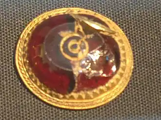 The gold strip may have been originally fastened to a shield or a sword belt,[19] or alternatively, it may have been part of the arm of a cross; a round cabochon jewel would have been fitted to the terminal end, and the other end would have fitted into the central fitting of the cross.[20]