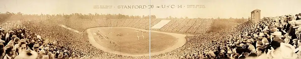 Stanford Stadium was built in five months in 1921 and opened its gates on November 19, replacing Stanford Field.[12] The first game was against rival California, who defeated Stanford 42–7 in the Big Game.[13] Seating capacity was originally 60,000, with a 66-row, U-Shaped structure second only to the Yale Bowl in size at the time.[14]