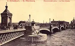 In 1842 he came up with the idea to build an iron bridge over the Neva River. The project was risky because of the construction conditions: a 12 meter deep river, with a strong current, ice floes in the winter, tidal waters, as well as the need to keep the river available for ships. Experts doubted at the time whether it is possible to build any bridge over the capricious river. The decision to entrust its construction to Kierbedź was taken by Tsar Nicholas I directly. Construction took 8 years and St. Petersburg gained a bridge 342 meters long, 20 meters wide, made of cast-iron with seven fixed spans and one drawbridge. It was named the Blagoveshchensky Bridge (later renamed Nikolaevsky Bridge after Tsar Nicolas's death).[6] On the opening day of the bridge, on 6 (18) November 1850, Kierbedź was awarded a specially stamped medal and promoted General-Mayor (Major-General).