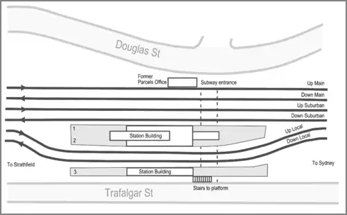 Stanmore Railway Station is entered from Trafalgar Street to the south and Douglas Street to the north via the pedestrian subway. The buildings are located at an important road intersection, with shopping precincts to both the north and south. The station group comprises a wayside platform with building, island platform with building, pedestrian subway, and parcel's office to the north. The current Inner West line uses the two southernmost tracks of the six tracks passing through the station.[3]