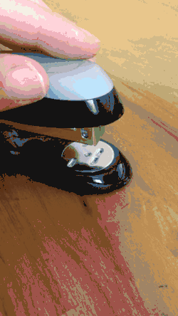 When using a stapler, the papers to be fastened are placed between the main body and the anvil. The papers are pinched between the body and the anvil, then a drive blade pushes on the crown of the staple on the end of the staple strip. The staple breaks from the end of the strip and the legs of the staple are forced through the paper. As the legs hit the grooves in the anvil they are bent to hold the pages together. Many staplers have an anvil in the form of a "pinning" or "stapling" switch. This allows a choice between bending in or out. The outward bent staples are easier to remove and are for temporary fastening or "pinning".