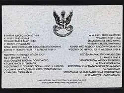 During World War II, the old convent was the site of a Soviet prison camp for Polish prisoners of war (POWs), especially officers. 48 of those who died in the camp were buried at the Starobilsk cemetery. In 1994, their bodies were moved to the Polish War Quarter built by the Council for the Protection of Struggle and Martyrdom Sites at the Chmyrivka cemetery. A plaque on the outside wall of the convent states that more than 4,000 Polish prisoners of war were confined inside the convent and ultimately executed in 1940. The Starobilsk prisoners were executed at the District Directorate of the NKVD in Kharkov and later buried in the forest in Pyatykhatky. These executions, together with executions of Polish officers held in POW camps at Kozelsk, Ostashkov, and some smaller camps, became known as the Katyn massacre.[2][3][4][5][6]