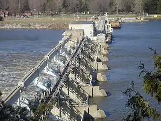 The Starved Rock Lock and Dam was constructed between 1926 and 1933 as an element of the Illinois Waterway.[1] The Waterway was a project designed to provide a navigable channel from the Great Lakes to the Gulf of Mexico via the Mississippi River.[4] The contract for construction of the lock and dam was originally awarded in 1923 but fell through when the contractor failed to show up for the contract signing.[3] Following a period of time during which land litigation issues were cleared, a second contract was awarded in 1926.[3] The lock and dam was about 95 percent complete when the state of Illinois fell upon financial difficulty and the project was turned over to the federal government for completion.[3] Under the authority of the Rivers and Harbors Act of 1930 the federal government oversaw the completion of Starved Rock Lock and Dam in 1933.[3] Construction of the facility cost US$4,462,737; of that amount, $3,577,419 was provided by the state and $885,318 was federal money.[3]