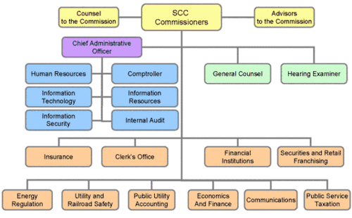 The SCC's authority encompasses utilities, insurance, state-chartered financial institutions, securities, retail franchising, and railroads. |