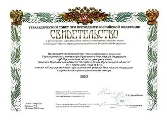 The State Heraldic Register of the Russian Federation is a list of descriptions and images of symbols that have received official approval in the Russian Federation, created "in order to systematize and organize the use of official symbols and distinctive signs".[1] Maintaining the register is assigned to the Heraldic Council of the President of the Russian Federation.[2]