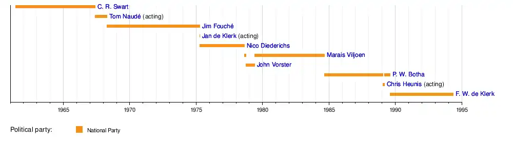 The office was abolished in 1994, with the end of Apartheid and the transition to democratic majority rule. Since then, the head of state and head of government is known simply as the President of South Africa.