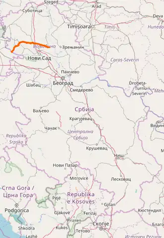 11205 | 0.937 km (0.582 mi) | 58.283 km (36.215 mi) | Zmajevo (Vrbas) – Zmajevo (Rumenka) (overlap with ![]() |
