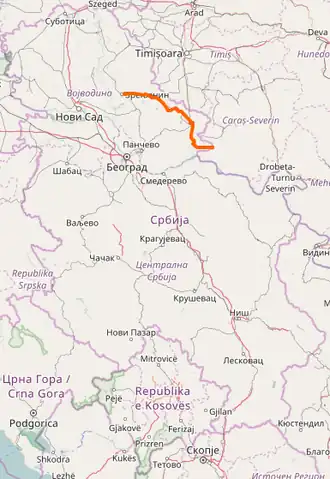 01808 | 11.452 km (7.116 mi) | 134.422 km (83.526 mi) | Bela Crkva – Serbia – Romania border (Kaluđerovo) |