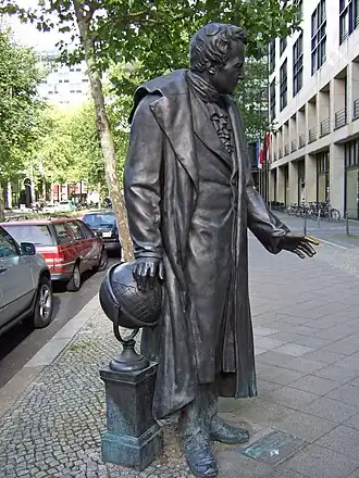 The Alexander von Humboldt statue in Tiergarten, Berlin, Germany, was unveiled on 31 August 1999.[1] It is a larger-than-life bronze statue of the scientist, explorer, and naturalist Alexander von Humboldt, who stands with his right hand resting on a globe, on top of South America.[2] It is in front of the entrance to the German Institute for Standardization (DIN), located in the Alexander-von-Humboldt-Haus building at 31 Budapester Straße.[2]