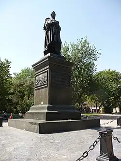 The Statue of Graf Vorontsov, Odessa, is a sculptural and former[1] monument established in 1863 on the Sobor Square in Odesa in honor of Mikhail Semyonovich Vorontsov, Field Marshal, the General-Governor of Novorossiya Region and plenipotentiary governor of Bessarabia who was a graf until 1845, then knyaz from 1845. The sculptor is Friedrich Brugger, the pedestal was made under the command of Sevastopol 1st guild merchant P.A. Telyatnikov.[2] and the architect was Francesco Carlo Boffo.[3] On 11 November 2023 the monumental status of the sculpture was scrapped.[1]