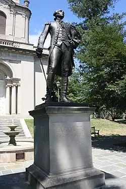 Marquis de Lafayette is a monumental statue on the campus of Lafayette College in Easton, Pennsylvania. The statue, designed by Daniel Chester French and standing on a pedestal designed by Henry Bacon, was dedicated in 1921 in honor of the college's namesake, Gilbert du Motier, Marquis de Lafayette. The statue is located at the south entrance of Colton Chapel. It is one of a number of sculptures made by French for universities, which includes the statue of John Harvard at Harvard University and Alma Mater at Columbia University.[2]