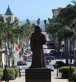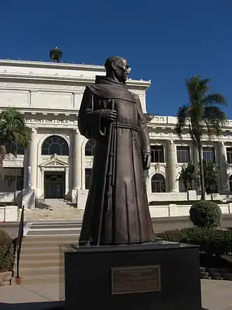 Junípero Serra was a Roman Catholic Spanish priest and friar of the Franciscan Order who founded nine Spanish missions in California. In 1782, Serra founded Mission San Buenaventura, his ninth and final mission, on a site that became downtown Ventura. Objections to the public display of Serra statuary cite the mistreatment of the Native American people during the mission era. Following Serra's canonization in 2015, Serra statues were vandalized at Carmel Mission (smeared with green paint, "Saint of Genocide" written on a headstone),[47] Monterey's Lower Presidio Historic Park (decapitated),[48] San Fernando Mission (hands painted red and word "murderer" scrawled),[49] Mission Santa Barbara (decapitated and covered in red paint),[50] and San Gabriel Mission (cut with electric saw and splashed with red paint).[51]