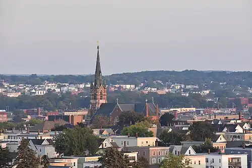 Ste. Marie Church is a Roman Catholic church on the West Side of Manchester, New Hampshire, in the United States. The church was founded to serve the needs of French-Canadian Catholic immigrants to New Hampshire. The Gothic Revival church building is a prominent feature on the Manchester skyline, and dominates the West Side skyline. The building is perched atop the plateau that makes up Rimmon Heights, and forms one of the focal points of the Notre Dame neighborhood, along with Lafayette Park across the street.