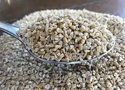 Steel-cut oats (US), also called pinhead oats, coarse oatmeal (UK),[1][2] or Irish oatmeal, are groats (the inner kernel with the inedible hull removed) of whole oats which have been chopped into two or three pinhead-sized pieces (hence the names; "steel-cut" comes from the steel blades).[3] The pieces can then be sold, or processed further to make rolled oat flakes, of smaller size than flakes of whole groats.[4] Steel-cutting produces oatmeal with a chewier and coarser texture than other processes.