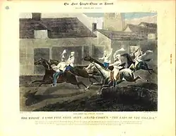 The steeplechase originated in Ireland in the 18th century as an analogue to cross-country thoroughbred horse races which went from church steeple to church steeple, hence "steeplechase". The first steeplechase is said to have been the result of a wager in 1752 between Cornelius O'Callaghan and Edmund Blake, racing four miles (6.4 km) cross-country from St John's Church in Buttevant to St Mary's Church (Church of Ireland) in Doneraile, in County Cork, Ireland.[1] An account of the race was believed to have been in the library of the O'Briens of Dromoland Castle. Most of the earlier steeplechases were contested cross-country rather than on a track, and resembled English cross country as it exists today. The first recorded steeplechase over a prepared track with fences was run at Bedford in 1810, although a race had been run at Newmarket in 1794 over a mile (1600 m) with five-foot (1.5 m) bars every quarter mile (400 m).[2] and the first recorded steeplechase of any kind in England took place in Leicestershire in 1792, when three horses raced the eight miles from Barkby Holt to Billesdon Coplow and back.[3]
