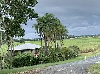 ![]() Looking south down Cabbage Tree Point Road over houses and cane fields across Steiglitz with a storm approaching, January 2022 | |||||||||||||||