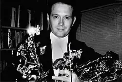 ![]() Johnson holding his MTV "Moonman" awards. | |