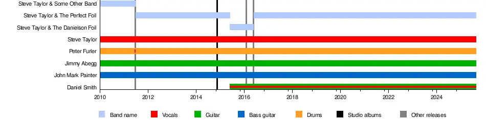 Steve Taylor & The Perfect Foil is an American alternative rock supergroup formed in 2010 by singer Steve Taylor with drummer Peter Furler (Newsboys, Peter Furler Band), guitarist Jimmy Abegg (Vector, A Ragamuffin Band), and bassist John Mark Painter (Fleming and John). Taylor formerly saw success as a new wave singer during the 1980s and early 1990s, and also fronted the short-lived band Chagall Guevara. However, by the mid-1990s he abandoned performing music and transitioned into work as a record producer, songwriter, and film-maker. In 2010 Taylor, who was frustrated at the slow pace of his fundraiser for his feature film Blue Like Jazz, collaborated with Furler, Abegg, and Painter to record the song "A Life Preserved" for the film's soundtrack, and began recording other material. Taylor, Abegg, and Painter then featured on the Peter Furler song "Closer", under the name "Steve Taylor & Some Other Band", on Furler's album On Fire. With those collaborations as a starting point, Taylor relaunched his career as a performing musician, and the lineup was branded as Steve Taylor & The Perfect Foil. The group released a studio album entitled Goliath on November 18, 2014 to critical acclaim and modest commercial success. In 2015, Daniel Smith of Danielson, with whom the band had been touring, joined on in a collaboration touted as Steve Taylor & The Danielson Foil. Under this incarnation, the group released the EP Wow to the Deadness on February 5, 2016, and toured until February 12. A live album under this incarnation of the band was also released, and the band also contributed to the soundtrack for the 2020 film Electric Jesus.
