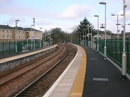 The rebuilt Stewarton station in 2010, looking towards Glasgow | |||||
