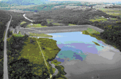 The Stillwater Dam is an embankment dam on the Lackawanna River in Susquehanna County, Pennsylvania. It is located 3.2 mi (5 km) north of Forest City and was completed in September 1960. The primary purpose of the dam is flood control and its reservoir is usually maintained at low levels for that purpose.[1] The high-water mark for the reservoir was on 2 April 1993 when it reached 1,617.85 ft (493 m) and a capacity of 88.9%.[2]