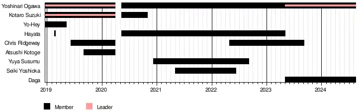 At Noah Majestic 2023 on May 4, Daga joined the unit after betraying Eita and aligning himself with Ogawa and Ridgeway.[29] At Noah Great Journey in Nagoya 2023 on June 17, Chris Ridgeway and Daga teamed up with Sean Legacy in a losing effort against Good Looking Guys (Jack Morris, Tadasuke and Yo-Hey).[30] After Chris Ridgeway's departure from September 5, 2023, the stable shrunk down to the tag team of Yoshinari Ogawa and Daga who were usually competing separately. At Noah Grand Ship In Nagoya 2023 on September 24, Daga defeated Junta Miyawaki in singles competition, while Ogawa teamed up with Naomichi marufuji and Leona in a losing effort against Kaito Kiyomiya, Ryohei Oiwa and Eita.[31] At Noah Demolition Stage In Fukuoka 2023 on October 28, Daga and Ogawa wrestled Hayata and Eita into a double pinfall.[32]