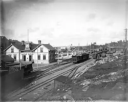 The station's history dates back to 1884, when a provisional wooden station was established near the intersection of Odengatan and Valhallavägen.[6] This temporary structure served as Stockholm Östra's station for nearly 50 years. The original plans to locate the station near Lill-Jans Plan were altered due to Stockholm city's demand for space to construct a "border boulevard," now known as Valhallavägen. As a result, the station was built on higher, more rugged terrain.[7]