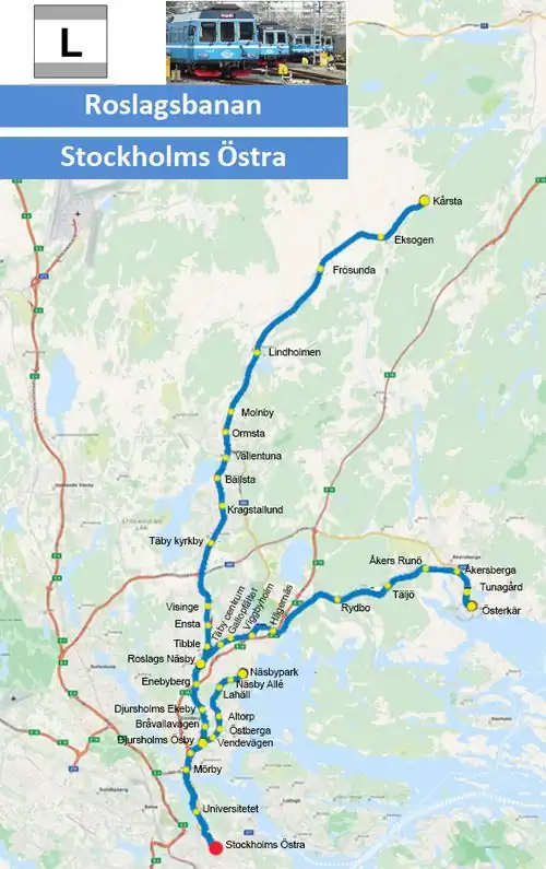 - ^ "Banguide - Roslagsbanan Stockholms Östra-Kårsta, Djursholms Ösby-Näsbypark, Roslags Näsby-Österskär - järnväg.net". www.jarnvag.net. Retrieved 2024-11-29.