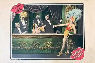 Stolen Kisses is a 1929 sound part-talkie American pre-code comedy film directed by Ray Enright and starring May McAvoy, Hallam Cooley and Reed Howes.[1] In addition to sequences with audible dialogue or talking sequences, the film features a synchronized musical score and sound effects along with English intertitles. According to the film review in Variety, 50 percent of the total running time featured dialogue.[2] The soundtrack was recorded using the Vitaphone sound-on-disc system.