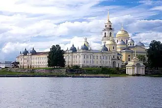 The island is the home of Nilov Monastery, which was founded by Saint Nilus in 1594, and previously welcomed up to 40,000 pilgrims each year. Most of the buildings of the monastery were built in the 18th and 19th centuries in a neoclassical style. Today the monastery complex remains one of the most impressive ensembles of Neoclassical architecture in Eastern Europe. Some of its churches date back to the 17th century. A graceful embankment was completed by 1812, and a large cathedral built in 1821-25. The construction of the causeway to the island was completed in 1812. The Nilov Monastery was one of the largest and wealthiest monasteries in the Russian Empire. Since the 1980s, many Russian Orthodox Christians commemorate the Feast of the Epiphany on January 19th by submerging themselves in the freezing waters, including those surrounding the monastery and the island.[1][2]