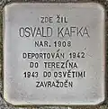 Kafka, OsvaldOsvald Kafka was born on 9 November 1908. His parents were Max Beniamin Meir Kafka and Beila Berta Kafková. His father traded with eggs. He had a younger brother, Otakar (born 1919). He was a train worker. Together with mother and brother he was deported on 26 November 1942 from Klatovy to Theresienstadt concentration camp by transport Cd. His transport number was 128 of 651. On 13 December 1942, his mother died in Theresienstadt. On 6 September 1943, he was deported to Auschwitz concentration camp by transport Dl. His transport number was 905 of 2484. He was murdered in a gas chamber of Auschwitz.[20][21]