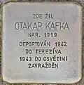 Kafka, OtakarOtakar Kafka, also Otokar, was born on 10 August 1919. His parents were Max Beniamin Meir Kafka and Beila Berta Kafková. His father traded with eggs. He had an older brother, Osvald (born 1908). Together with mother and brother he was deported on 26 November 1942 from Klatovy to Theresienstadt concentration camp by transport Cd. His transport number was 129 of 651. On 13 December 1942, his mother died in Theresienstadt. Seven days later, on 20 December 1942, he was murdered by the Nazis in Theresienstadt.[22][23]