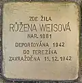 Adlerová, RůženaRůžena Adlerová née Fröhlichová was born on 16 June 1874. Her parents were Leopold Fröhlich and Barbora née Herrmann. She was married to Jakub Adler. The couple had at least three sons and two daughters, Josef (also Jozef, born 1904), Anna (born 1906, later named Pisinger), Ota (born 1908), Jindřiška (born 1910) and Jaroslav. Her husband was a merchant, she was a housewife. She and her children Ota and Jindřiška were deported on 26 November 1942 from Klatovy to Theresienstadt concentration camp by transport Cd. Her transport number was 169 of 651. In Theresienstadt, the family was separated. First, in January 1943, her daughter Jindřiška was deported to Auschwitz concentration camp. She was murdered there. Then, on 6 September 1943, her son Ota was deported to Auschwitz. He was murdered there too. At last, on 15 December 1943, also Růžena Adlerová was deported to Auschwitz by transport Dr. Her transport number was 44 of 2,519. She was murdered there.[7][8]