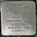 Brno to Theresienstadt concentration camp by transport Ah. Her transport number was 268 of 1,001. Seven weeks later, on 25 May 1942, the parents and their daughters were deported by transport Az, according to Yad Vashem to an "unknown place", according to holocaust.cz to Lublin. Her transport number was 879 of 997. At age three, the girl was murdered in the course of the Shoah, also her sister and her parents.[18][19] | Anna Libuše Pollaková was born 15 November 1938. Her parents were Alfred Pollak and Helena née Mandlová. She and her sister Růžena Naděžda (born 1935) grew up in Tišnov. On 4 April 1942, all family members including the two little girls were arrested and deported from|