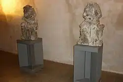 Inside these eight niches were statues. All were placed on brackets and protected by baldachins. Between the windows of the first floor were statues of kings and queens sitting on the throne. By their side, they were accompanied by knights in full armour. The torsos of these statues were reassembled from fragments by Jan Blažej and can be seen today in the chapel located on the ground floor. The statues in the niches of the second floor were not preserved. It is speculated, that there may have been the statues of saints – Czech patrons – Wenceslaus I, Vitus, Adalbert of Prague, and Procopius of Sázava. The ground-floor part of the facade could not be fully renovated due to poor condition. However, after findings of a horse rump, it is speculated that an equestrian statue could have been placed above its portal. The layout of the statues on the front facade and the ornaments refer to both the architecture of cathedrals, as well as ancient Byzantine art.