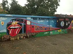 In 2012 Schröder and artist Heino Jacobsen made a design of a mural painting of forty metres in length. Subsequently, Jacobsen painted it on ten garage boxes in Lüchow, for six weeks, twelve hours a day. The artwork was inaugurated in July, when The Rolling Stones had their fiftieth anniversary.[5] The image is not graffiti but is manually painted. It portrays a train and its major stations in the career of The Rolling Stones.[6]