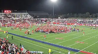 Stony Brook lost its first two games in 2011 to FBS teams, falling to UTEP 31–24 in overtime after allowing 21 unanswered points and being routed 35–7 by Buffalo.[36][37] The Seawolves fell to 0–3 by losing to Brown 21–20 in the home opener.[38] Then, Stony Brook began a program-record nine-game winning streak, beating Lafayette 37–20 in the conference opener and scoring at least 40 points in each game for the rest of the regular season. The Seawolves set the Big South single-game points record by crushing Gardner-Webb 76–28 and defeated Liberty 41–31 in the de facto Big South Championship Game to earn the conference's automatic bid to the FCS playoffs, Stony Brook's first.[39] In the first round of the 2011 FCS Playoffs, Stony Brook paired up against in-state rivals Albany, coming back from an 18-point deficit to defeat the Great Danes 31–28 in front of a then-record-setting crowd of 8,286, capped off by a game-sealing interception from safety Dominick Reyes.[40] In the second round, Stony Brook lost 34–27 to top-seeded Sam Houston State to end the season at 9–4 (6–0 Big South).[41]