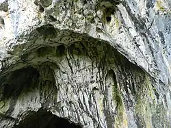 It contains a 9.5 m-tall (31 ft) waterfall called the "Spring of Life", speleothems and unusual tufa "bathtubs", cave formations which fill with water in time, and then overspill creating a cascade flow. In the section of the cave known as the River Canal, there is a whirlpool. Beneath it, the tufa slide is formed, which spreads into the tufa cascades. Between the cascades, the "bathtubs" and gigantic "pots" are located. During the higher influx of water, the cascading water forms the fully fledged "Spring of Life" waterfall.[2][5][6]