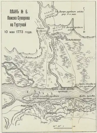 The first engagement ended in Russian victory under Suvorov's leadership,—he seized Turtucaia itself; the second engagement began under Russian Major Rehbock (in accordance with the disposition), – he managed to capture the retrenchments, – and was completed with the reinforcements of Suvorov. In spite of Colonel Baturin's disorderliness, who lined up two infantry squares on the mountain and did not support Rehbock, as he should have done according to the disposition of personnel, and thus almost led the Russians to defeat, the second engagement also ended in Russian victory.[1][2] In the second engagement, Russian forces were again at a severe disadvantage, as Suvorov was ill and was to battle against the brave and able Egyptian commander in Sari Mehmet Pasha, who had elite troops, but nonetheless won.[4]