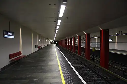 Stovner is a subway station on Grorudbanen (Line 5) on the Oslo Metro, between Rommen and the end station Vestli; was opened in 1974. The station is underground, at the entry of the tunnel. At or above the station is the large Stovner shopping centre, the Stovner police station, and a small bus terminal. Stovner is mainly a residential area.