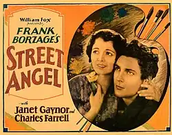 Street Angel is a 1928 American synchronized sound drama film. Although the film contains no audible dialogue, it was released with a synchronized musical score and sound effects using the sound-on-film movietone process. Directed by Frank Borzage, the film was adapted by Harry H. Caldwell (titles), Katherine Hilliker (titles), Philip Klein, Marion Orth, and Henry Roberts Symonds from the play Lady Cristilinda by Monckton Hoffe.[2] As an early, transitional sound film, it used intertitles, recorded sound effects and musical selections, but did not include recorded dialogue.[3]
