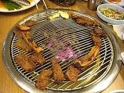 Galbi | Galbi is a term which means rib and typically come from pork or chicken. It is a popular dish where the meat is marinated with a mixture of soy sauce, garlic, sugar, and sesame seeds. It is usually placed on a stick since the stick is readily available to dispose and to cook on a grill. Of course, beef galbi can be used to make soup (galbitang) and steamed galbi (galbijjim). But these dishes, while excellent in their own right, are overshadowed by their grilled leader.[17] | ![]() |