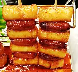 So-tteok-so-tteok | A South Korean street food consisting of skewered and fried garae-tteok (rice cakes) and Vienna sausages brushed with several sauces including mustard and spicy gochujang-based sauce. | ![]() |