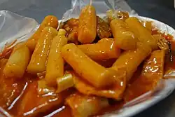 Tteok-kkochi | A street food consisting of skewered and fried tteok (rice cakes) brushed with spicy gochujang-based sauce. | ![]() |