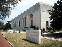 Among American architects, the work of Paul Philippe Cret exemplifies the style. His Château-Thierry American Monument built in 1928 has been identified as an early example.[16] Among his other works identified with the style are the exterior of the 1933 Folger Shakespeare Library in Washington, D.C. (though not the Tudor Revival library interior), the 1937 University of Texas at Austin's Main Tower, the 1937 Federal Reserve Building in Washington, D.C., and the 1939 Bethesda Naval Hospital tower.[16][17][18]