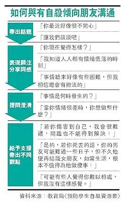 - ^ 教育局 (October 2010). "預防學生自殺資源套" (PDF): 29. Archived from the original (PDF) on 8 September 2020. Retrieved 26 November 2017.