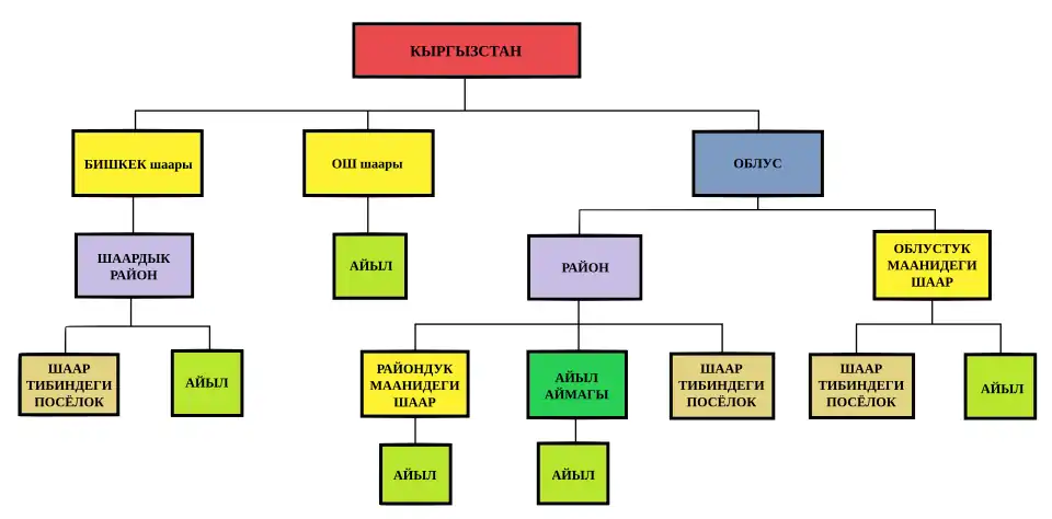 Kyrgyzstan has three levels of local government. The top level is formed by the regions (Kyrgyz: облус, romanized: oblus) and the cities of republican significance. The regions are divided into districts (Kyrgyz: район, romanized: rayon) and cities of regional significance. The districts are divided into cities of district significance, urban-type settlements (Kyrgyz: шаар тибиндеги посёлок, romanized: shaar tibindegi posyolok) and village communities (Kyrgyz: айыл аймагы, romanized: ayyl aymagy).[1][2][3]: 2–3 [4]